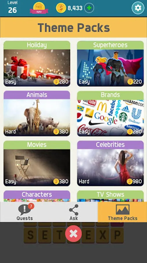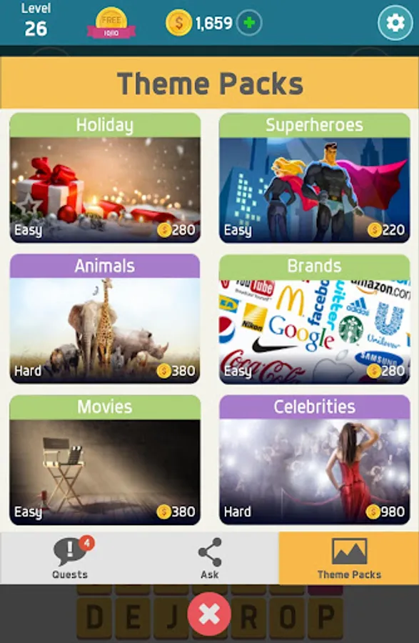 - Word challenges come in varying difficulty packs