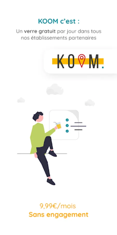 L’abonnement de 9,99€ / mois sans engagement permet à toutes les personnes disposant d’un compte KOOM de bénéficier d’une boisson offerte chez nos différents partenaires. Pas de panique, tu peux rejoindre l’application mobile KOOM sans payer l’abonnement. Tu pourras donc découvrir les différents services et partenaires avant de créer ton compte si tu le souhaites.