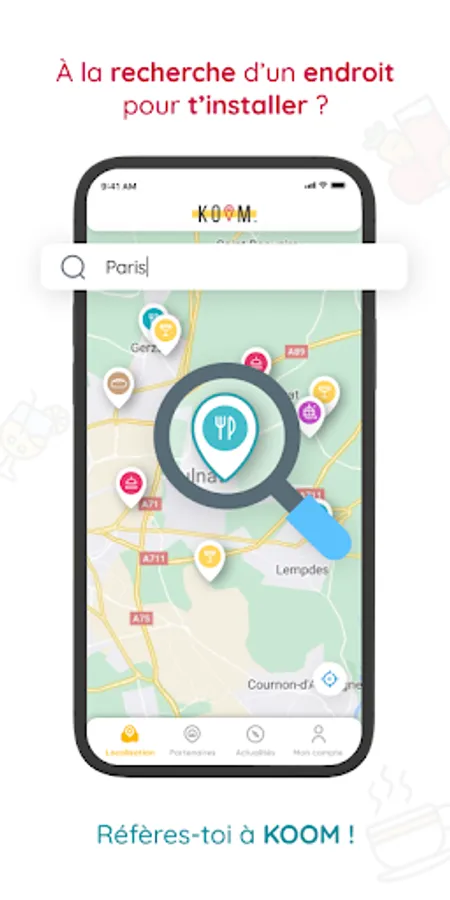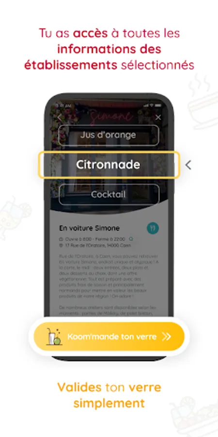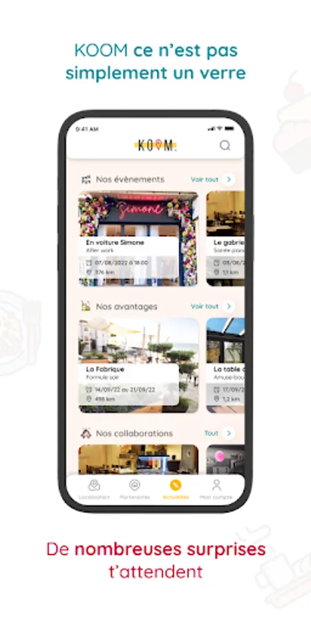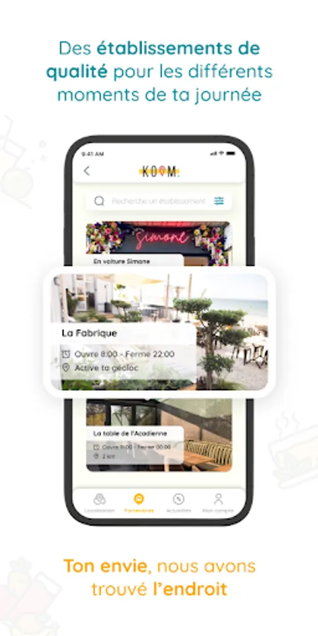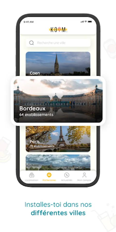 Tu as la possibilité de voir les établissements au plus près de toi en activant ta localisation. Koom te guide vers les établissements que tu souhaites découvrir. Après avoir sélectionné la ville de ton choix, tu choisis l’établissement qui te convient. Une fois arrivé chez notre partenaire, rien de plus simple, swipe “KOOM’mande ton verre” avec le serveur pour bénéficier de la boisson que tu auras pu visualiser en amont sur l’application.