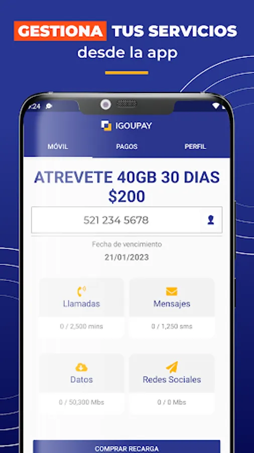 The "Igoupay" App is the easiest option to manage your account, make payments or top-ups and hire additional services without having to contact our service center or go to an authorized distributor.