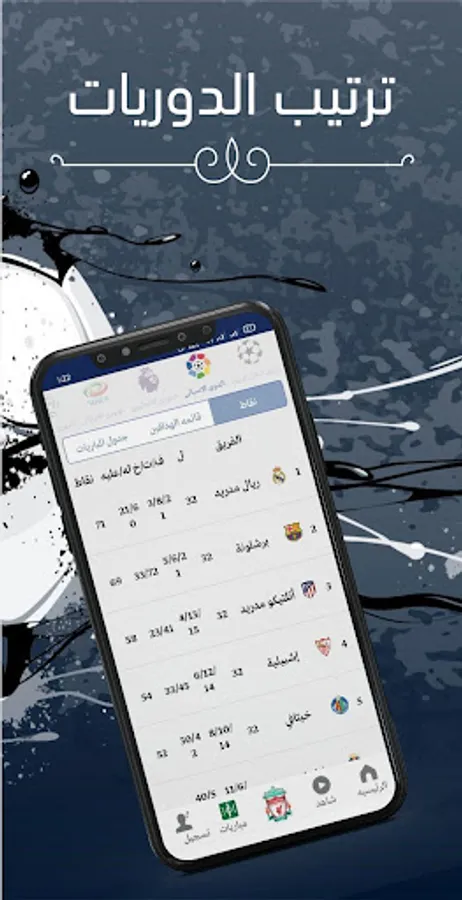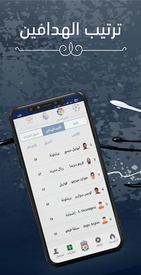 The application contains the ranking of European and Arab leagues, and the top scorers in each league.
