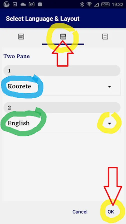 - "two panes" to display the Koorete at the top and the English version at the bottom