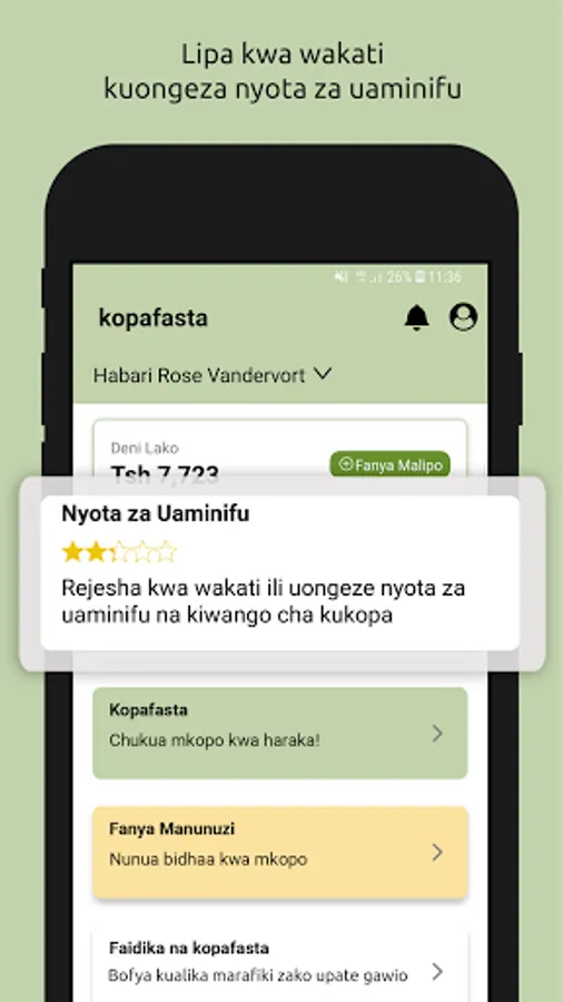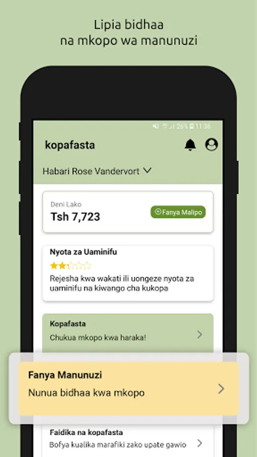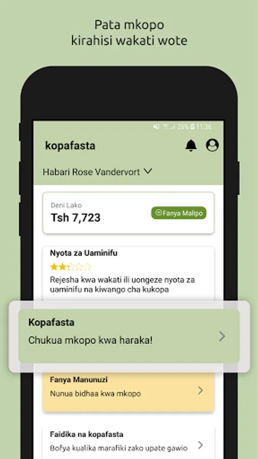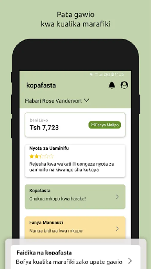 kopafasta is a leading QR Microfinance entity in Tanzania which helps in improving peoples’ lives from various groups of people such as micro-producing sectors, informal and formal sector, and institutions through provision of its services using state of the art technology, via professional and dedicated human capital.