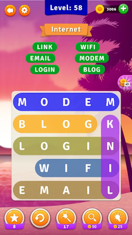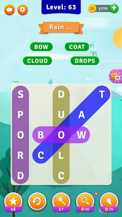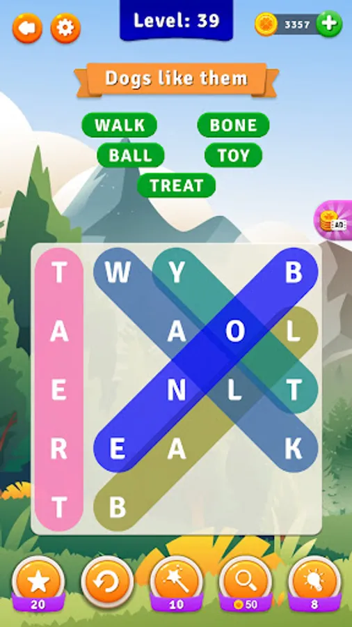 Find the hidden words in the puzzle by matching the letters right, left, down, up and diagonally. Complete the puzzle and collect the gold rewards. Are you struggling? Do not worry.