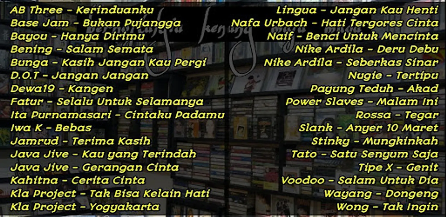 A collection of old Indonesian pop songs in the 90s era offline which were booming at the time and were often listened to. For those of you online game kids, please step aside and give the cassette tape generation a chance to reminisce..He..he..he..