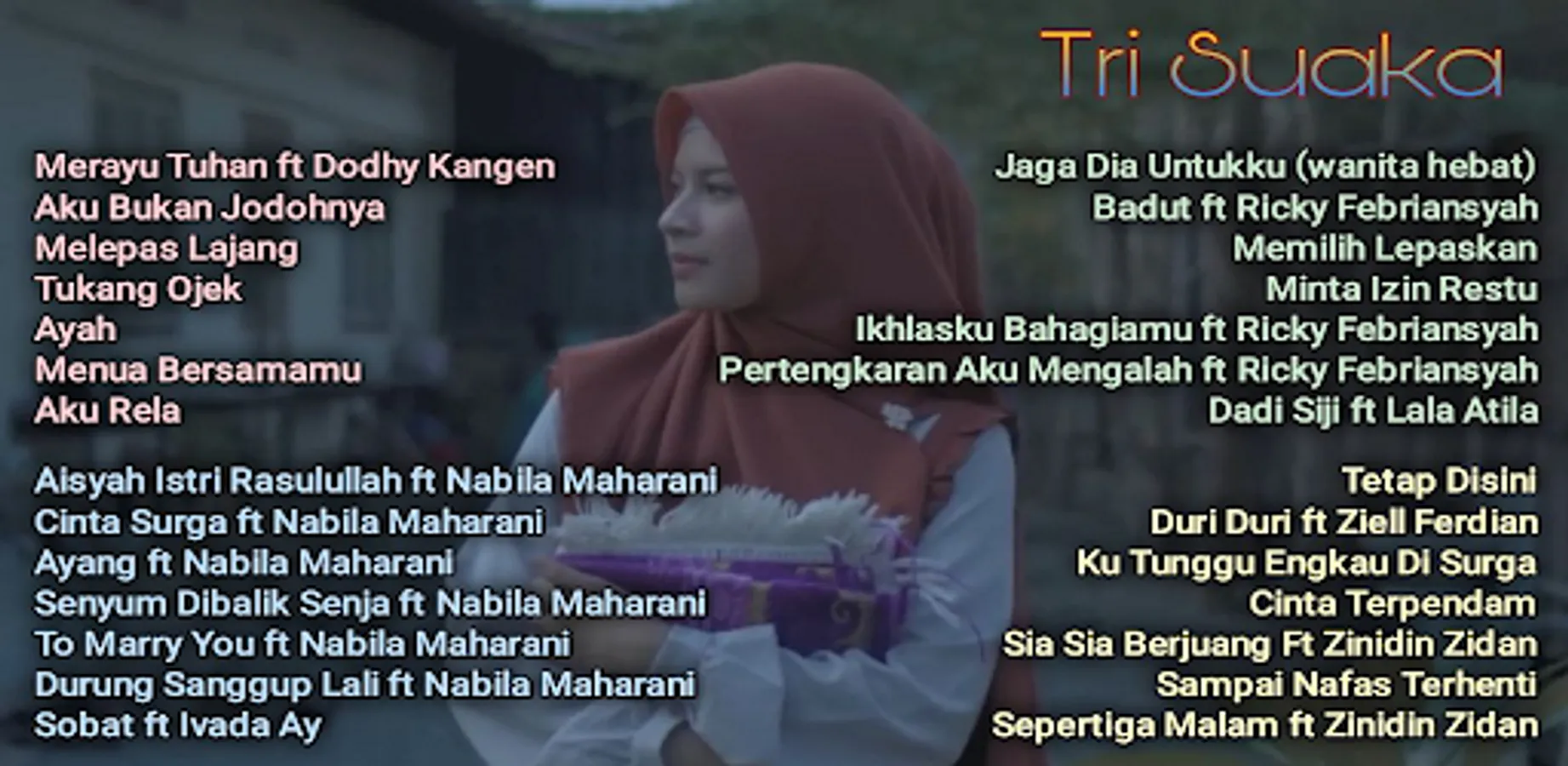 The Tri Suaka application feat Nabila Maharani is a duet between lovers who are now officially married. Other singers who often collaborate are Zinidin Zidan, Ricky Febriansyah, Valdy Nyonk, etc.