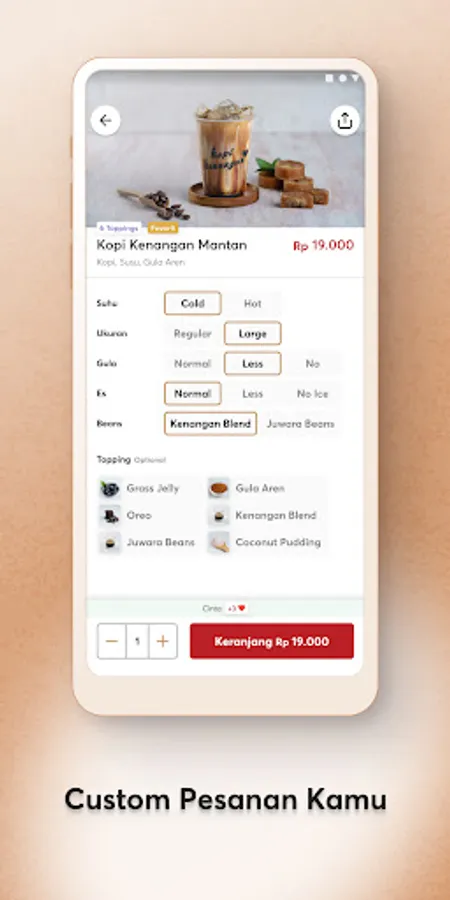 - Custom each item according to your preference (customizable temperature, size, sugar, ice, toppings, or variants)... everything through the app.