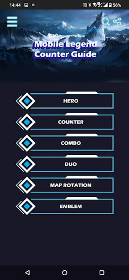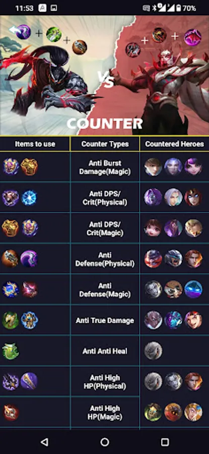 The application provide complete hero attribute, role, countered, counter and item build. With this, it will open the opportunity to understand more in game mechanic system and moreover you reach and be the best player to your favorite hero Globally and share to your friend by using this guide application.