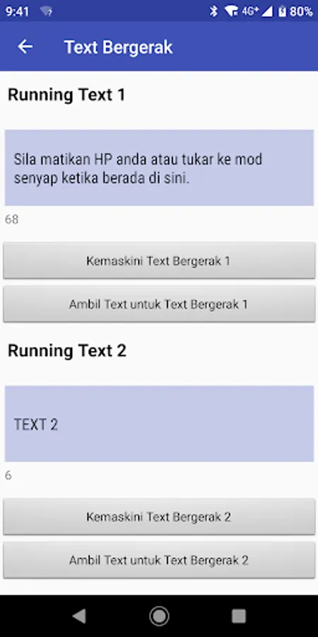 • Can display information or info in the form of moving text. There are 3 moving text that can be included in the application with each text maximum of 500 characters. Ideal for announcements, lecture schedules, current info, Hadiths and reminders for scholars.