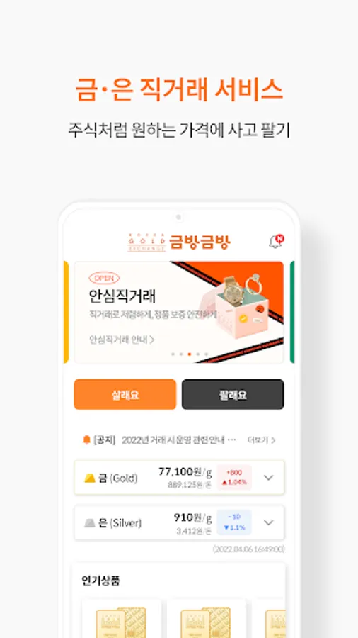 Geumgeumgeumbang provides gold and silver appraisal and asset storage services, and enables purchase/sale of gold and silver and physical withdrawal in various forms manufactured and guaranteed by the Korea Gold Exchange.