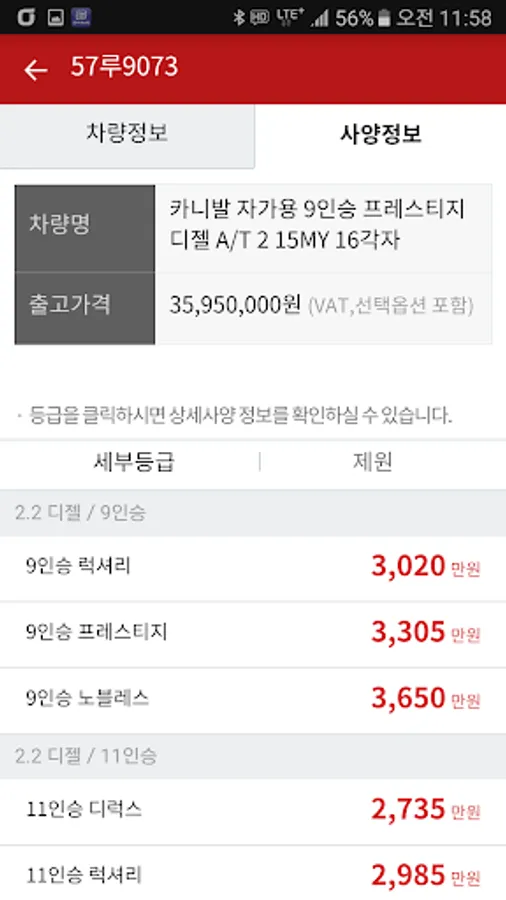 차량번호로 차량의 신차가격 및 사양정보를 확인할 수 있는 사양조회서비스