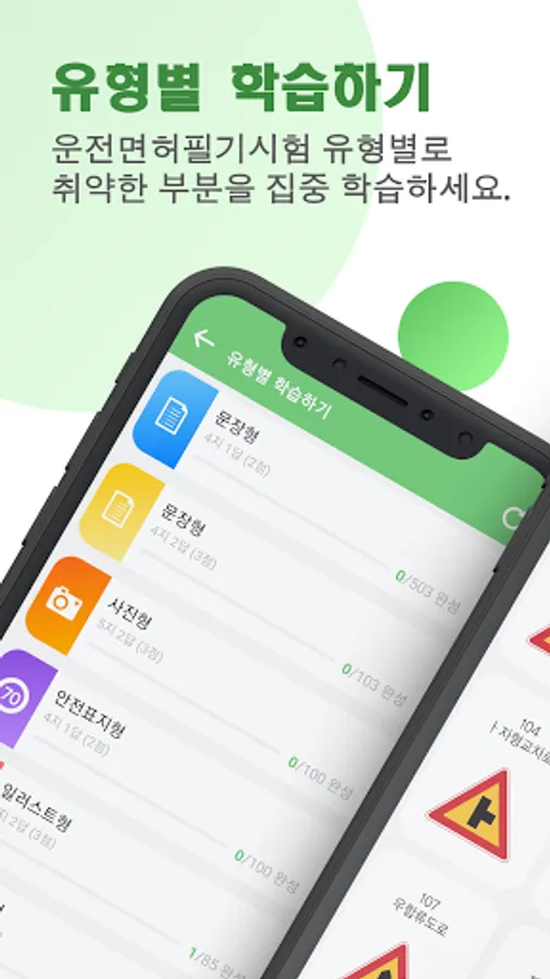 Provides the ability to learn questions by type of driver's license subject test, such as sentence type, safety sign type, photo type, illustration type, and video type.