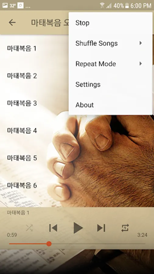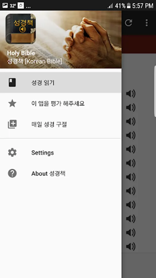 Bibles and Praises Read Korean Bible on your Android phone! Includes both the Old and New Testaments. This is offline content so you can read the scriptures anywhere. This app also contains Korean Bible from the old and New Testament freedom, audio version for all chapters. This app reads verses for you in Korean. So this Korean Bible audio version, when you do not have time to sit and read you can listen to the word of God or while you are jogging driving. Audio streaming online, you need to listen to it and connect to the internet. This Korean Bible App is perfect for Korean people who want to learn the Bible in Korean language. You can share your favorite verses with your friends via text messages, social networks or email. With the background player feature, you don't have to open the app every time you hear your favorite verse. Bible on your phone. No more books. Portable to use. The Bible can go with you everywhere.