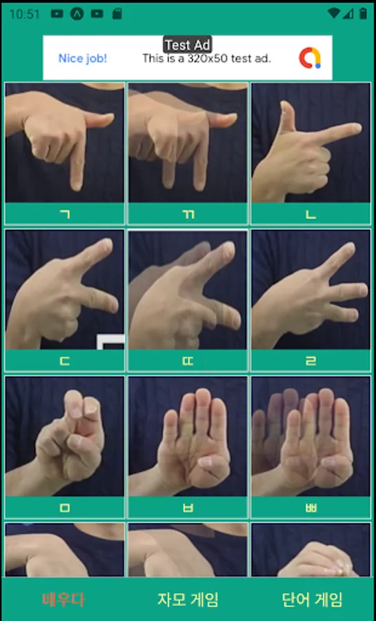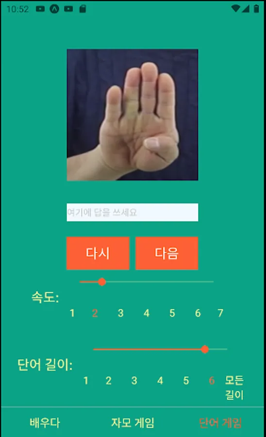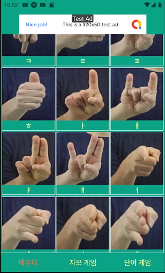 이 응용 프로그램은 수화에 대한 한글을 배우는 데 사용됩니다. 두 가지 게임이 있습니다. 하나의 게임은 글자를 배우는 것입니다. 다른 게임은 말로 연습하는 것입니다. 즐기세요! 😀