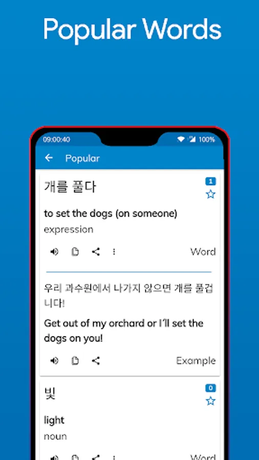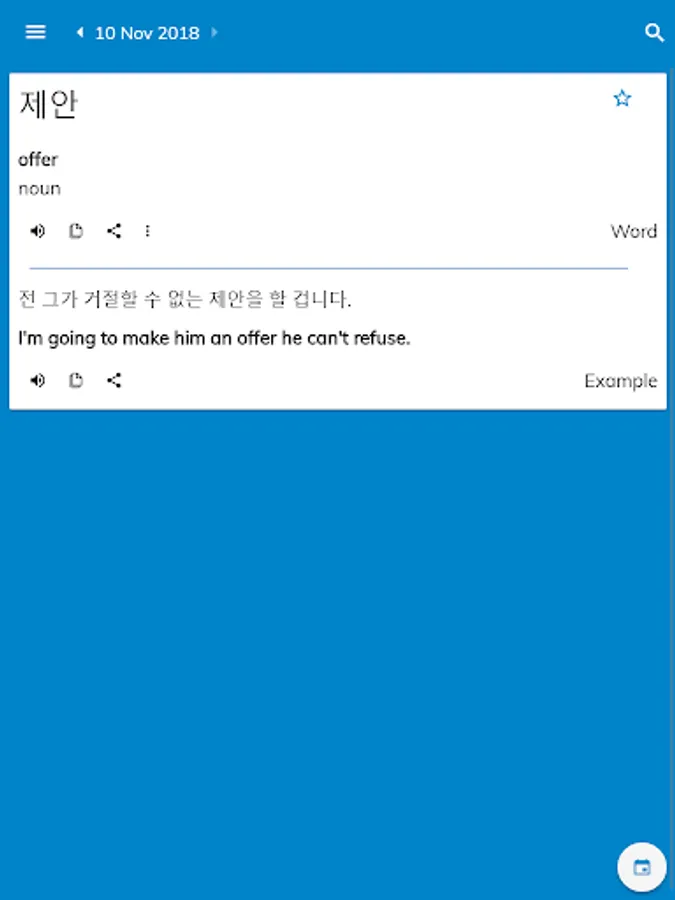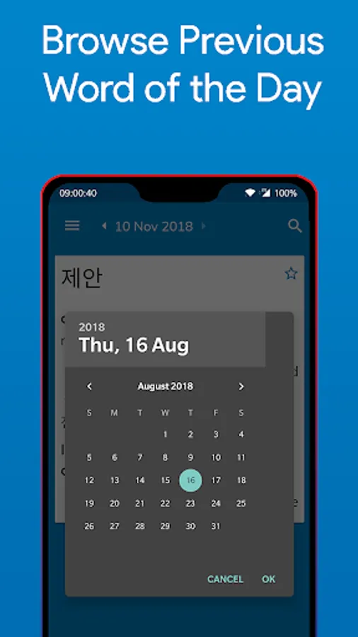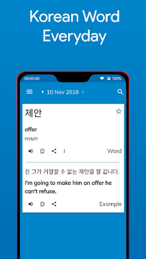 Learn a word a day from Korean! This app will allow you to set a notification time to get a reminder for today's word. we have you covered as we update a new word daily at 5:30 AM (GMT).