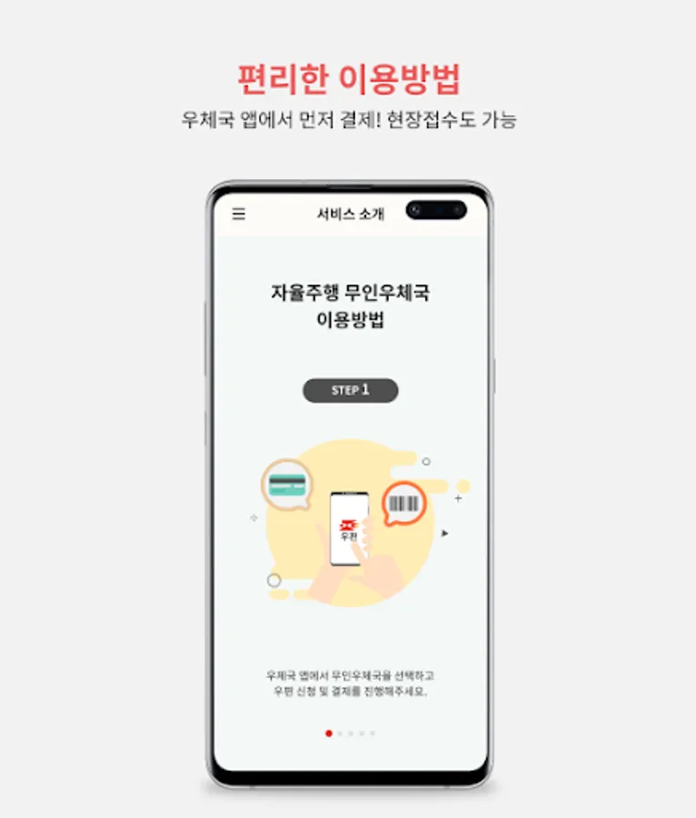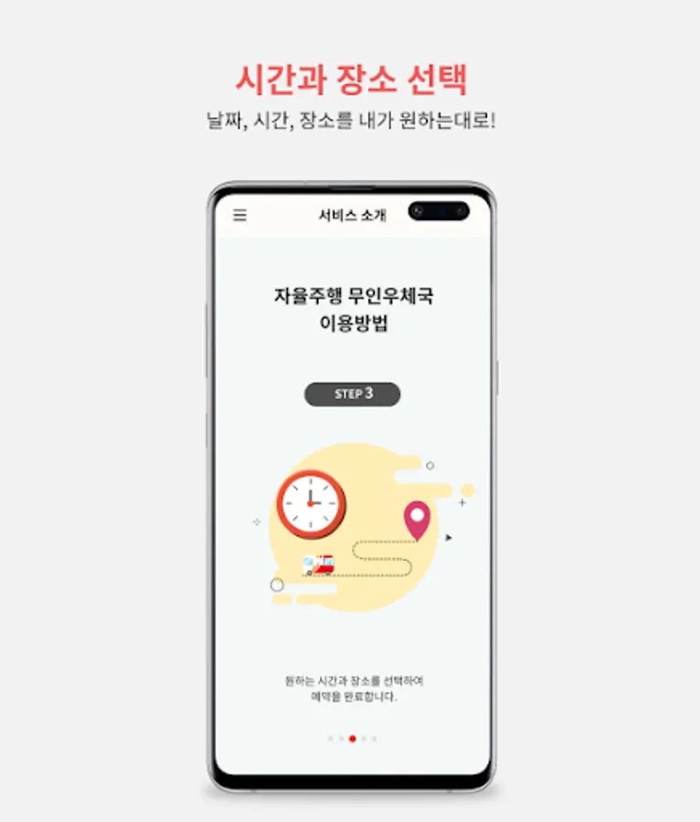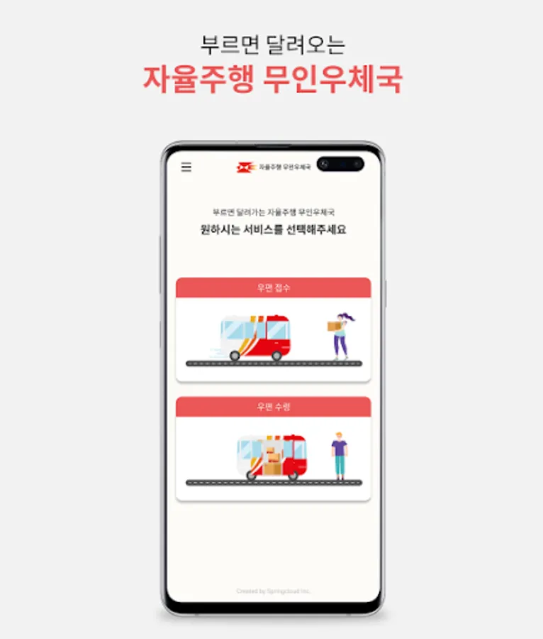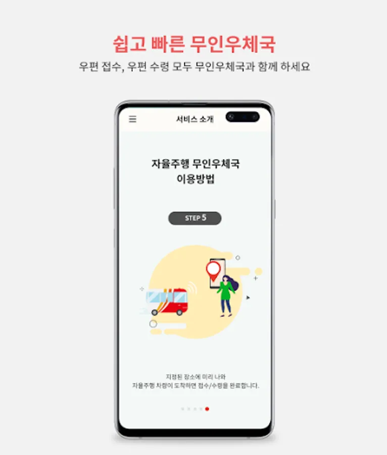 - 우체국 앱으로 사전 접수 및 결제 후, 자율주행 무인우체국 앱으로 우체국을 호출합니다.
