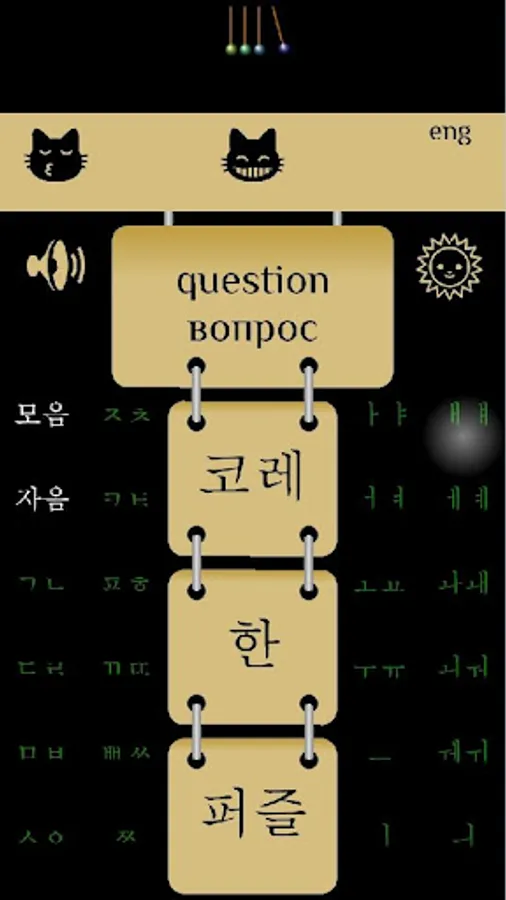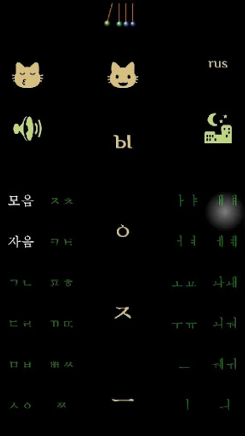 Korehan allow you to learn korean alphabet, set the symbols groups for learning, and your results will be saved inside app. If you wish, you can clear the results, with pressing cat head symbol on left on screen. Speaking of new question can be muted. The screen foreground color and background color can be interchanged.