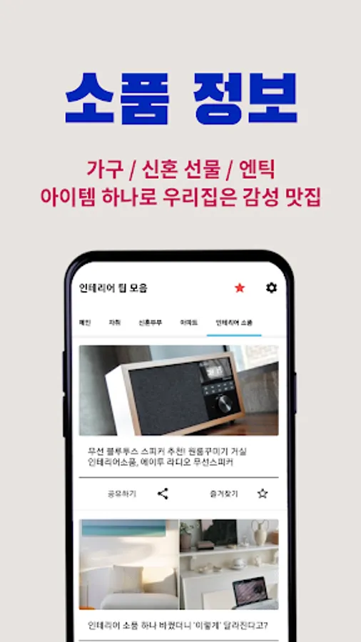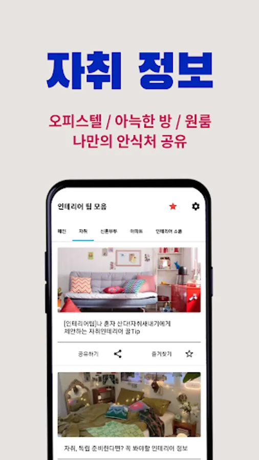 The interior tips collection app provides information for those who are interested in interior design, such as single-person households and newlyweds' apartments.