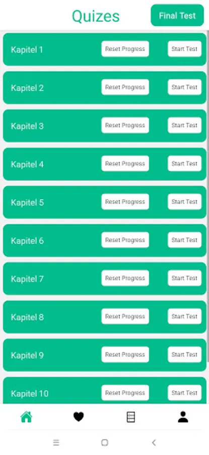 Du kan göra ett obegränsat antal tester med 70 frågor. Det finns totalt 800 frågor under 10 olika kapitel, där du får alla teoridelar som behövs. Efter att du har pluggat färdigt, då kan du öva på slutprovet där du får slumpmässiga val av frågorna.