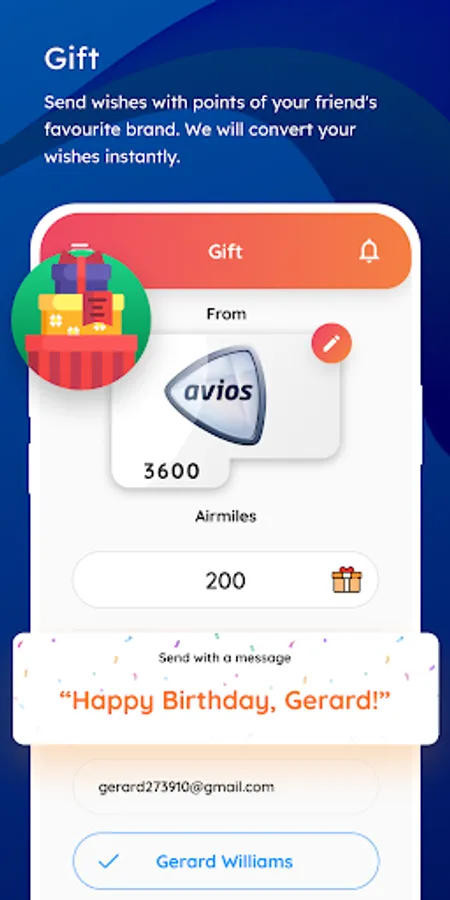 Gift: You can send points to family and friends on occasions. Add a personalised message and send points of the brand they love.