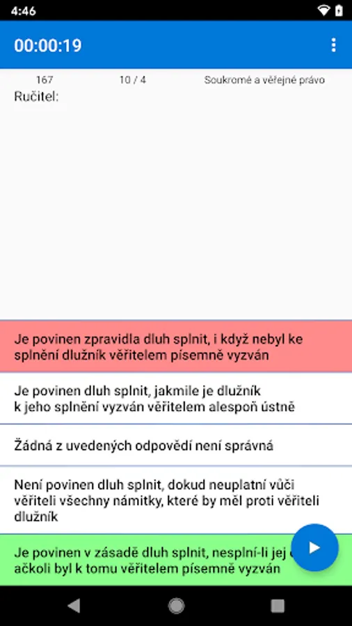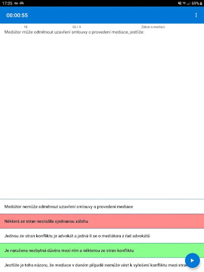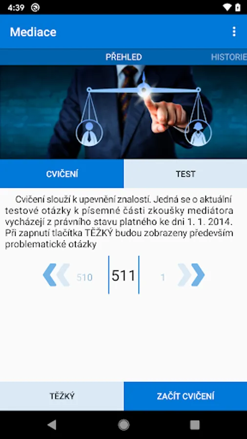 The questions are processed using legislative abbreviations of the relevant legal regulations and are based on the legal status valid as of 1 January 2014. Thus, they are up-to-date according to the latest legislation published on the website of the Ministry of Justice. In the application you can choose the number of questions to practice or generate a random test from all areas: