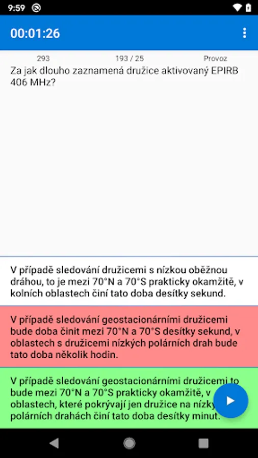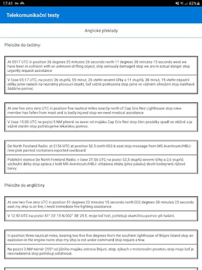 It is possible to choose a test according to the required certificates of proficiency or exercise. Questions are based on radiocommunication regulations, radiocommunication operations, electrical engineering and radio engineering. Questions are continuously updated and supplemented in the application.