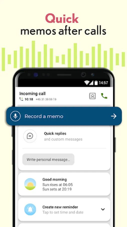 With our handy recorder app, there is no more forgetting what you just agreed on during a phone call while you look for a pen and paper to write down a date, time, or contact name. At the end of each call, you will see a screen with the caller’s details, and a one-click function that allows you to record an audio memo.