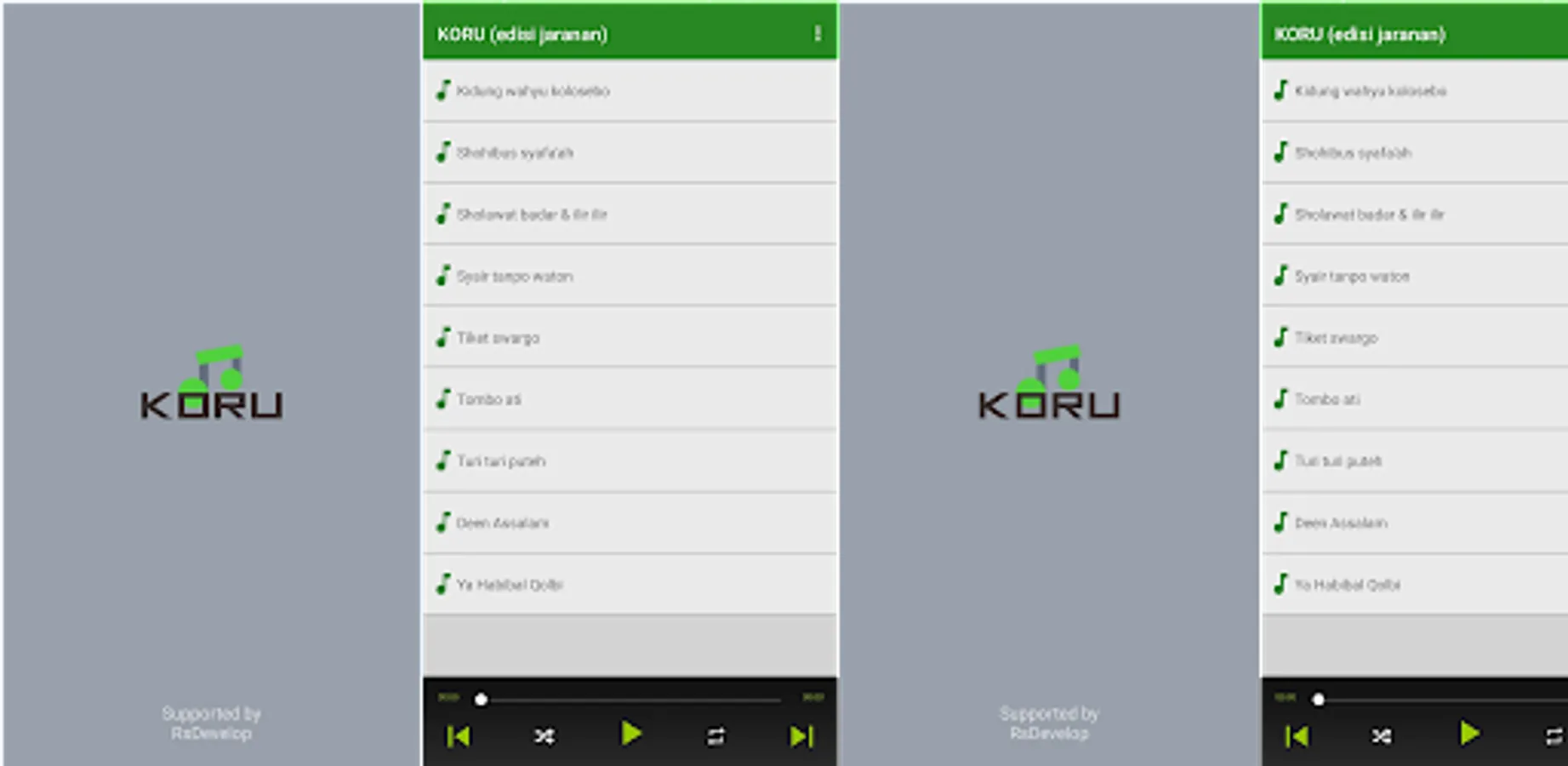 KORU (Sholawat jaranan version) is a media player platform for music player with .mp3 extension, KORU shares instrument and/or cover music whose lyrics or songs are not intact unlike the original song or music. The mp3 song that KORU (Sholawat version of Jaranan) is showing here, to protect copyright, the quality of the mp3 is only and or less than 128kbps. If you like the original music and the quality of the music is good, please buy it at the official music store to get the best quality mp3 songs.