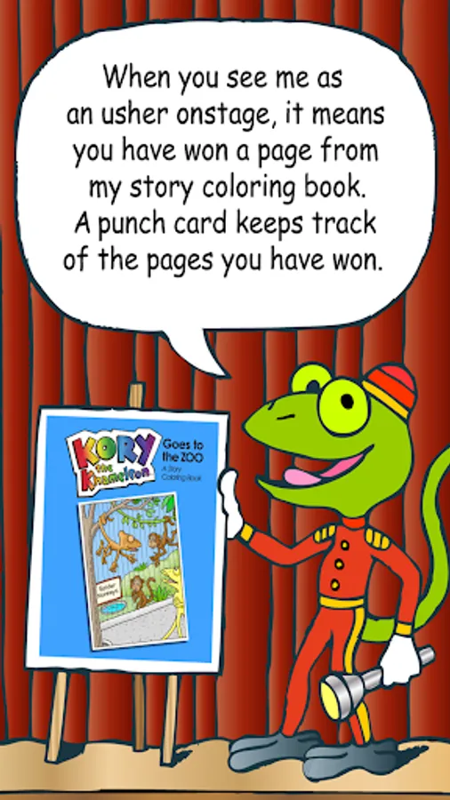 Kory and his family "Kory-O-Graph" a scene, by posing a certain way and changing their body colors, to act out words for you to guess. They can change their skin to look like clothes, other animals, machines, etc. Their long tongues and tails can also change color, to become props, speech bubbles and lots of other things.