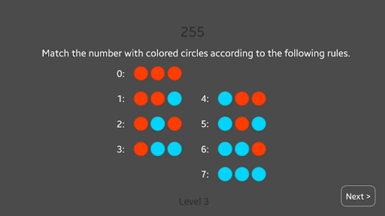 The rules of the game are simple: match each digit of number to three colored circles, but to do this you will have to remember the number.