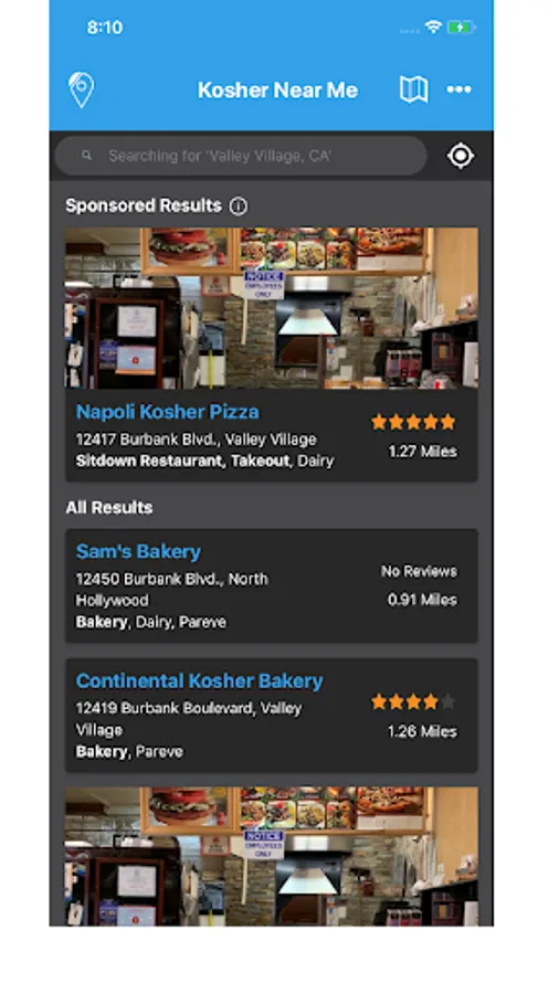 Kosher Near Me is the International Kosher App that lets you easily search a radius for local Kosher Establishments throughout the world. By default it automatically detects your location by GPS. You can also search within a location such as a postal code, a city or a place (like an airport or a landmark). Kosher Near Me operates in many countries with new ones being added all the time. Our current list includes: United States, Israel, United Kingdom, France, Canada, South Africa, Australia, Argentina, Brazil, Austria, Belgium, Switzerland, Chile, Costa Rica, Czech Republic, Germany, Ecuador, Spain, Gibraltar, Greece, Hungary, Italy, Japan, Lithuania, Luxembourg, Mexico, Netherlands, Panama, Russia, Turkey, Venezuela, Poland, Thailand, China, Singapore, Hong Kong, South Korea and Finland.