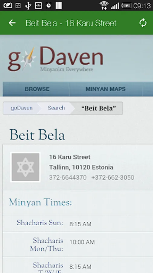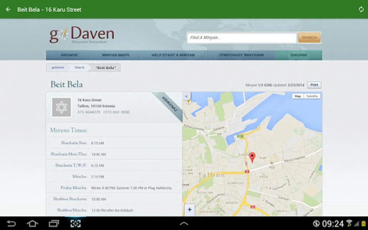 You can find the nearest minyan, synagogue or a place to daven on the map. Information is provided by GoDaven.com (http://godaven.com).