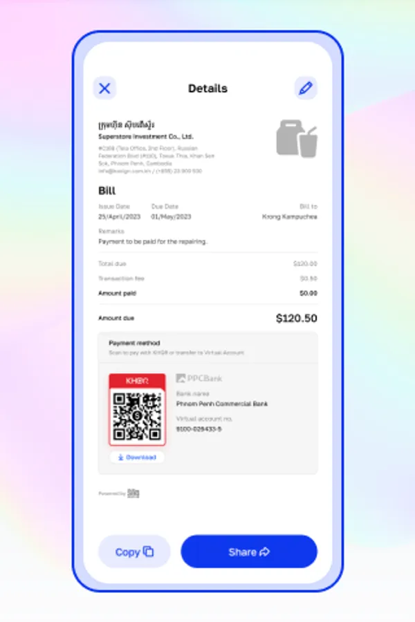 WeBill is commited to help businesses manage their billing and collection processes including customer managment, bill creation with KHQR, payment processing, and reporting.