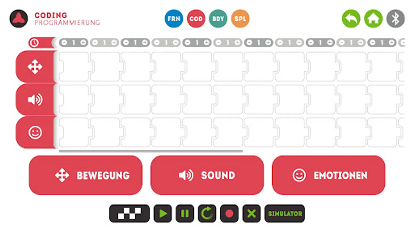 CODING with 2 modes: PROGRAMMING - movements, sounds and facial expressions of the robot can be programmed here simply and intuitively. The programmed sequence can be checked with the SIMULATOR before transmission.