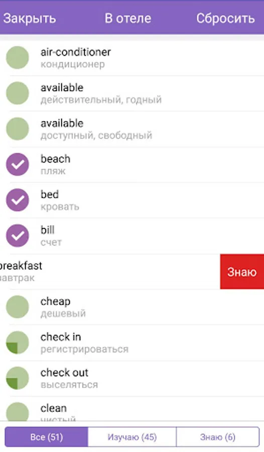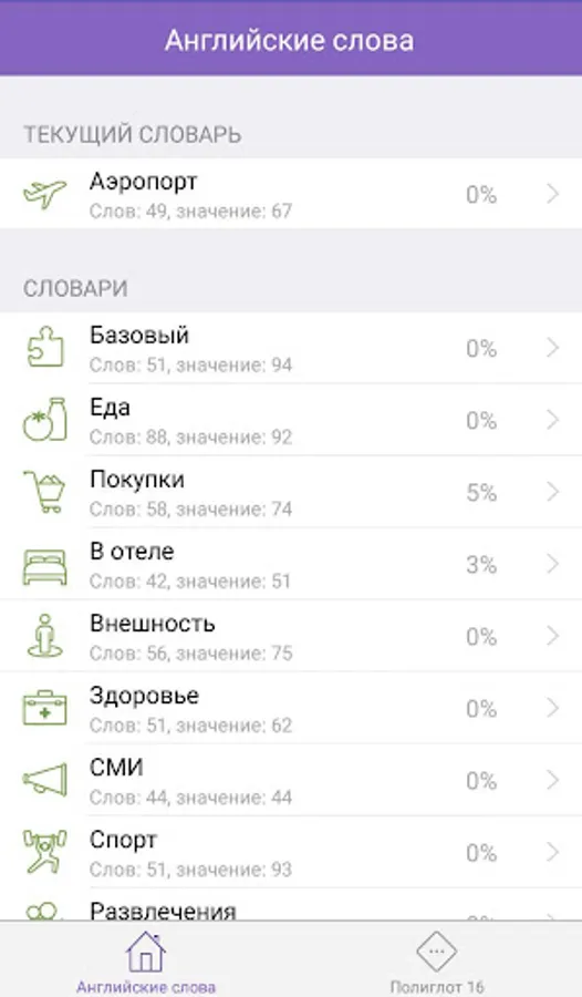 All words are divided into categories, each category can be noted that the words you already know and teach only what is necessary.