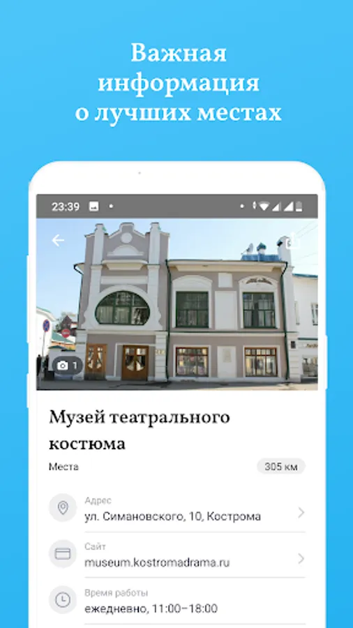 Choose places to your taste or use ready-made routes. In addition to the sights, you will also find useful places: hotels, restaurants and administrative buildings with time and other useful information.