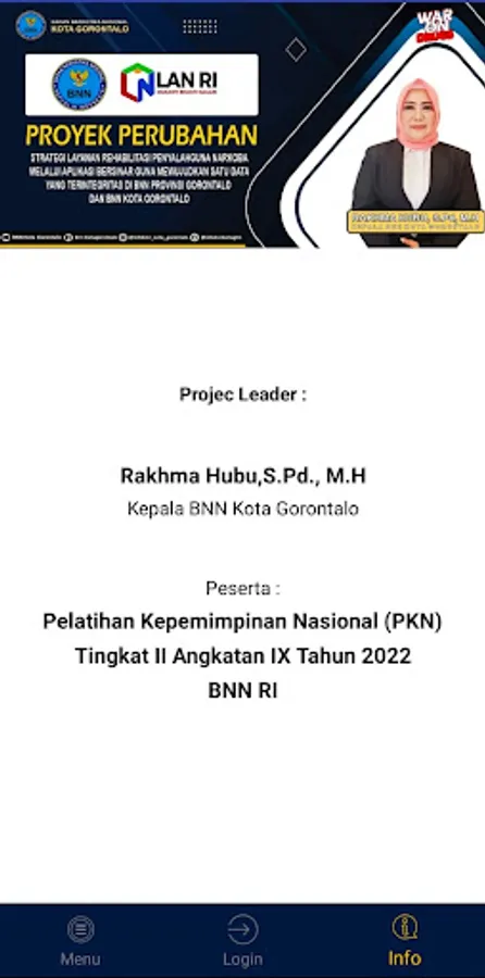 The Shining Application (Together with Drug Rehabilitation) is a Project Application for the Change of the Head of the Gorontalo City BNN Rahkma Hubu S.Pd., M.H at the National Level II Leadership Training LAN RI with the theme of Rehabilitation Services Strategy for Narcotics Abusers through the Shining Application to Realize 1 (One) Integrated Data at BNN Gorontalo Province and BNN City Gorontalo