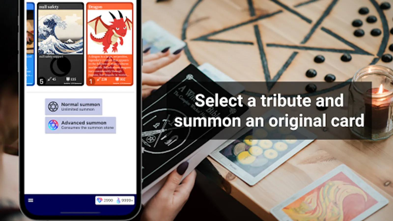 Select an image as the tribute for the card, decide on the card name, and the original card will be summoned. The status of the card depends on your luck.