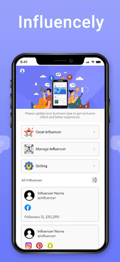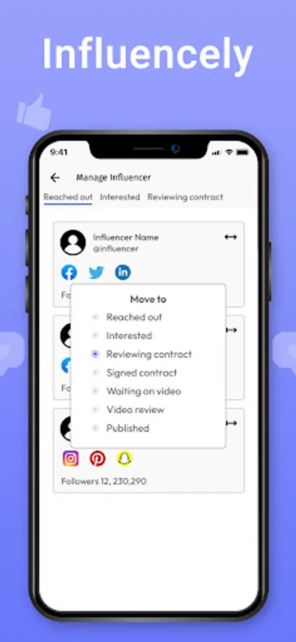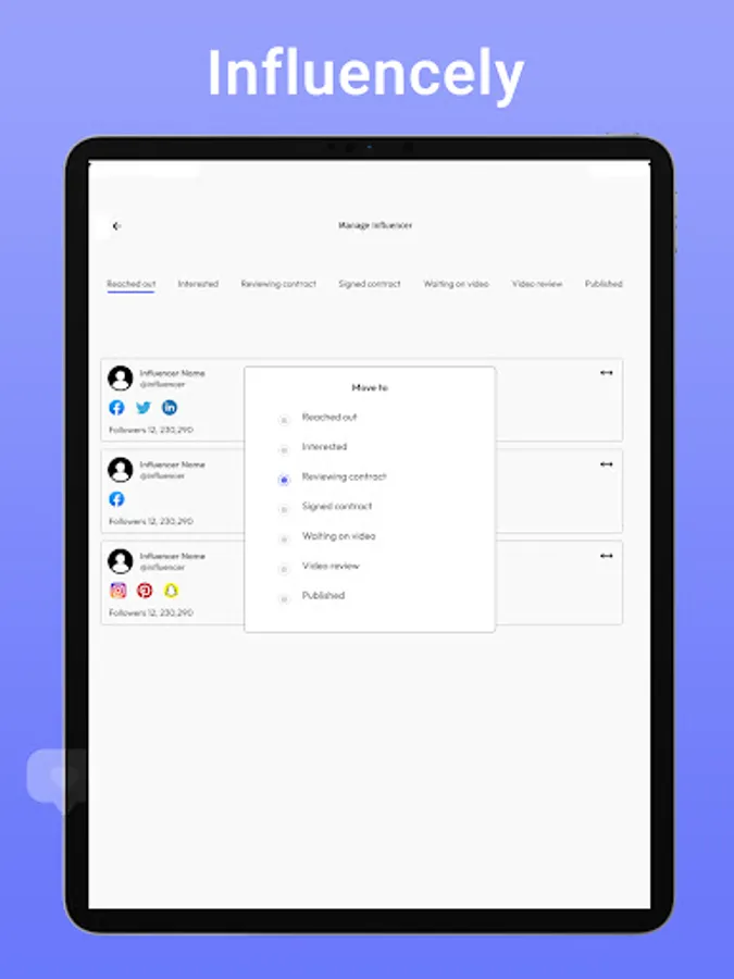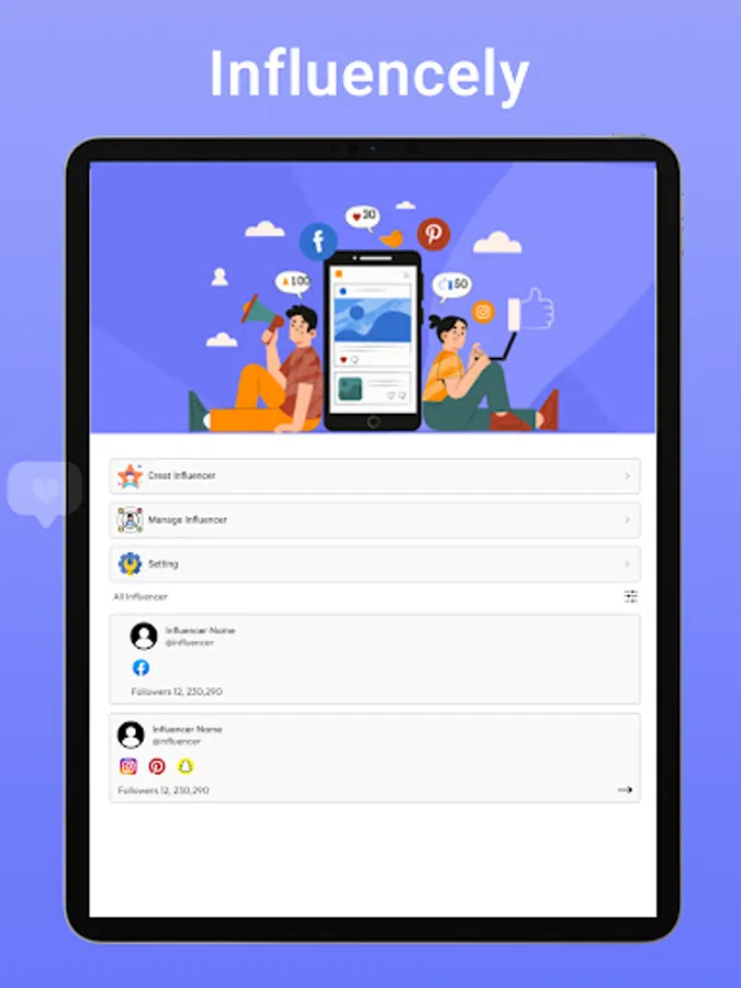 Influencly is a mobile that you can use to track your creators! Across Tik Tok, Instagram, and many other platforms! With built in notifications for alerting when a user needs paid or how well a video does, we cover the analysis completely! You can track video views, followers, videos, and invite other people from your team to use the service. Never lose track of your influencers again!