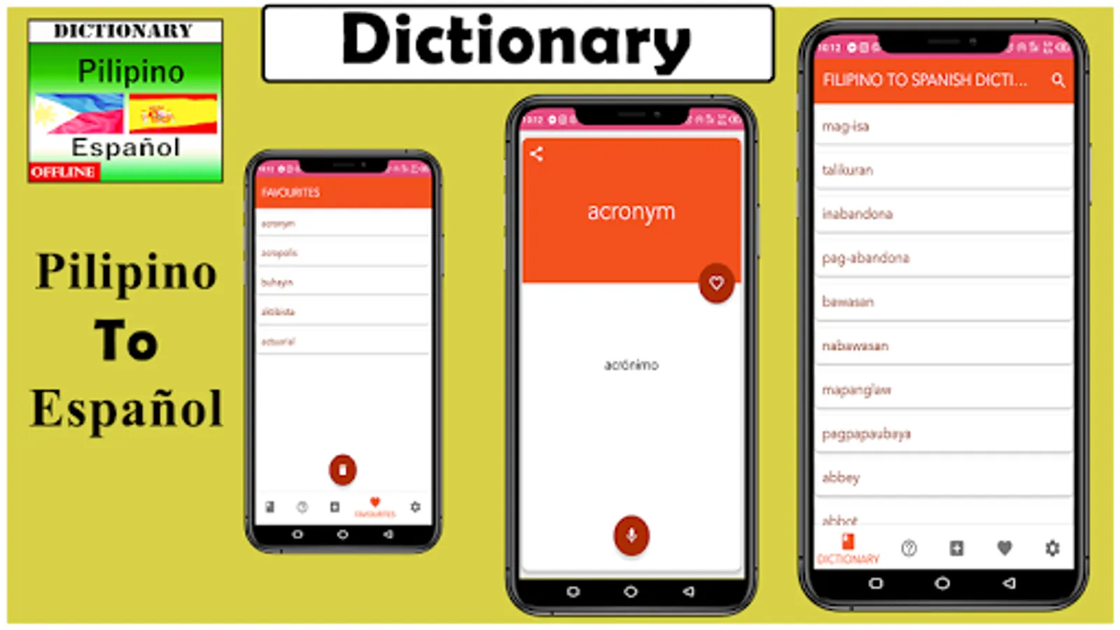It is FREE Dictionary app from Filipino to Spanish. It has very special Features like easy to access and use and it also consume less space to install. Filipino Spanish dictionary is helpful to find Arabic meanings in split seconds. You can use this Filipino to Spanish dictionary app for meanings of complex words. Filipino Spanish dictionary app works with fast speed and has speech to text feature. You can see its icon on notification bar to open it quickly.