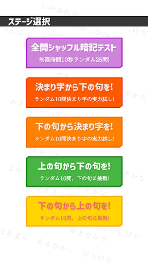There are 5 types of stages in total, and we have prepared a time-limited "all-question shuffle memorization test", one that answers the lower phrase from the upper phrase, and one that answers the upper phrase from the lower phrase.