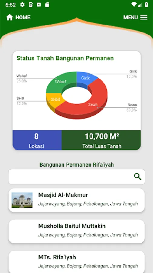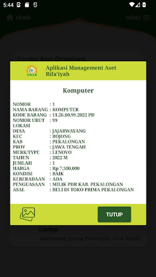 Karto stands for Collection of Rifa'iyah Household Assets. This module contains organizational data and assets in the form of non-land and building assets, these assets are in the form of organizational inventory, such as: Laptop Assets, Computers, Motorcycles, Cars and others.