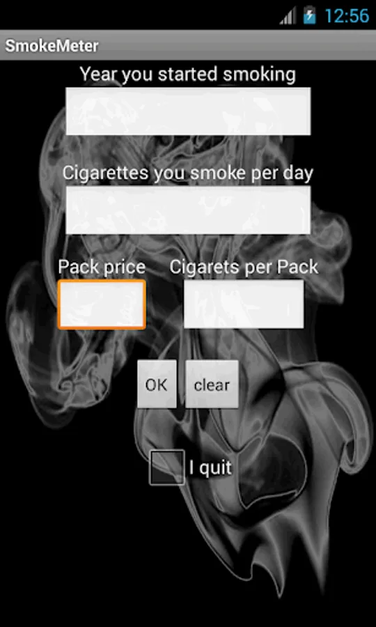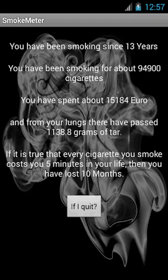SmokeMeter can make calculations (or estimations) using different data regarding smoking during all this time you have been smoking. Data such as: Money you have spent on cigarettes, years you have been smoking, number of cigarettes you have consumed, etc.