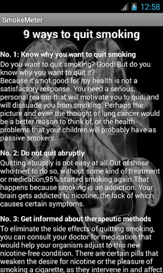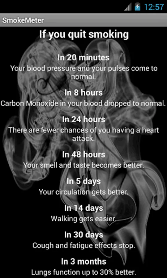 In addition, SmokeMeter can give you some pieces of advice on how to quit smoking. After making this crucial decision, SmokeMeter will count how long you have quitted smoking, the money that you have saved as well as your health benefits.