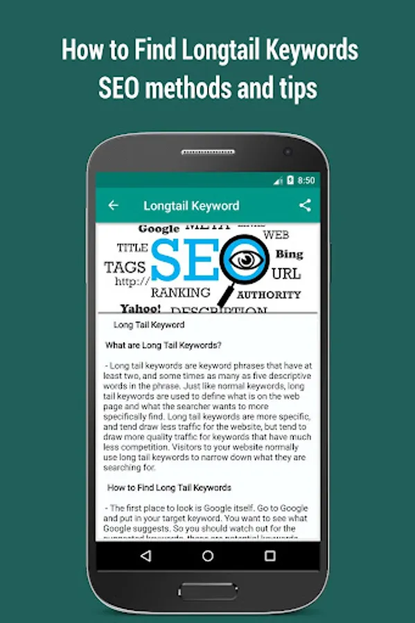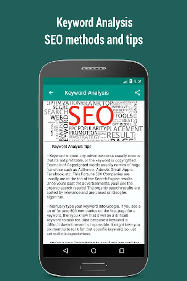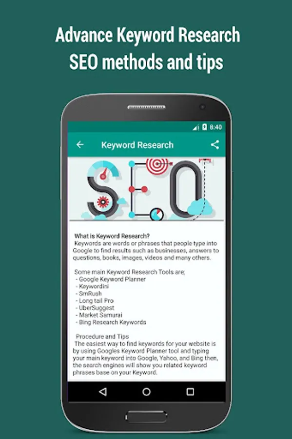 SEO (Search Engine Optimization) being the activity of optimizing Website pages or whole sites in order to make them more search engine friendly, thus getting higher positions in search results, this app provides the knowledge needed for you to master SEO.