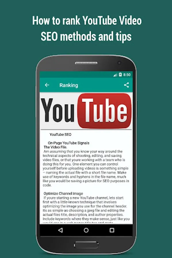 Advance SEO Secret Guide basically offers step by step procedures on how to Optimize your Websites, mobile and YouTube Channel. This app goes as far as: