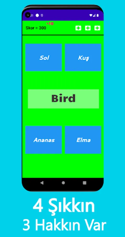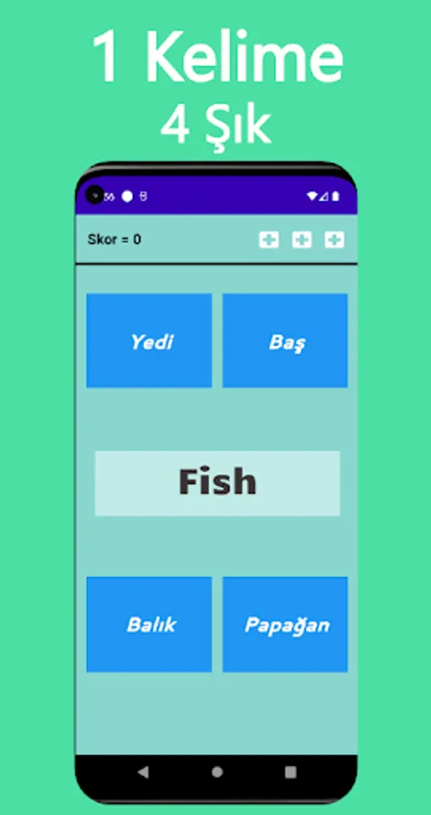 English word game; You have to specify the English word and find the correct one among the 4 Turkish words in the options.