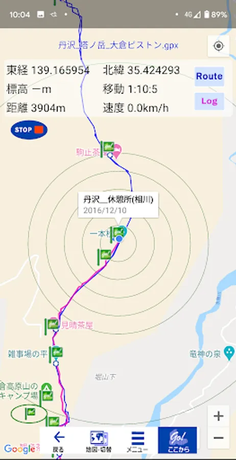 You can switch between your own map (hereinafter jMap) and Google map (hereinafter gMap). Normally, we use jMap, which can be operated only by GPS even in areas where mobile radio waves do not reach, but in a complicated urban area such as starting from a station, in order to confirm the current location surely, gMap, which also shows the building shape in detail, is also available. Used together.