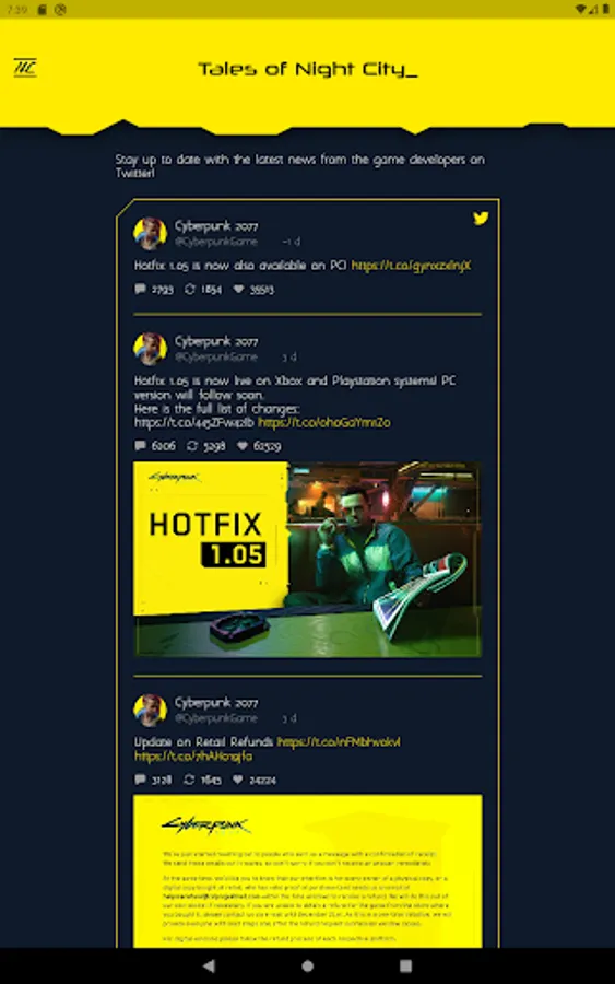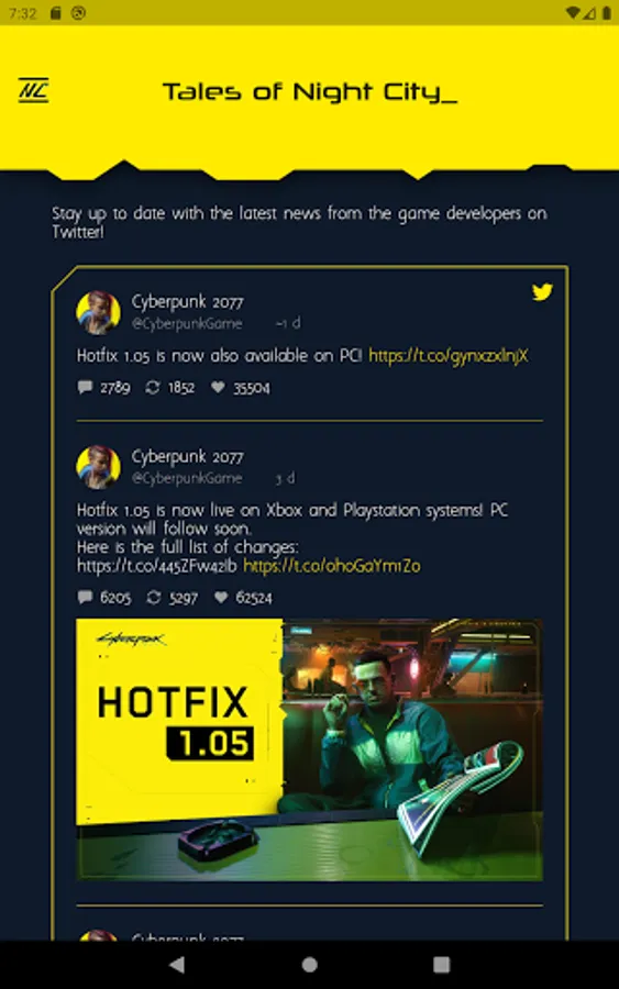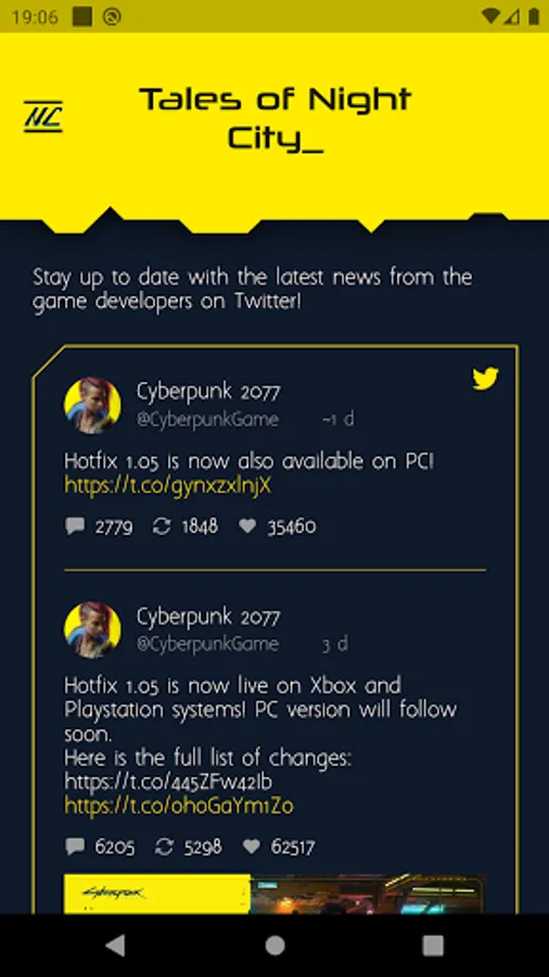 - Newsfeed section with the latest tweets from @CyberpunkGame (Twitter)