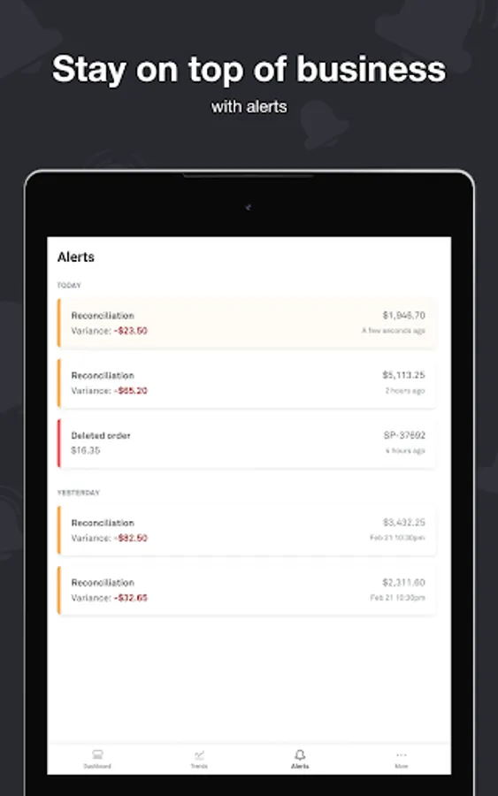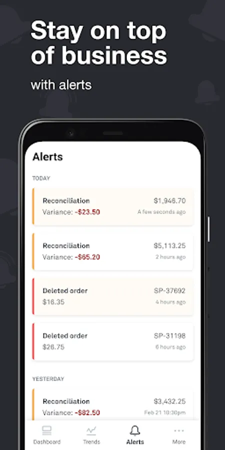 Take care of business with instant notifications for things like deleted orders & reconciliations with variances - so you can follow up fast.